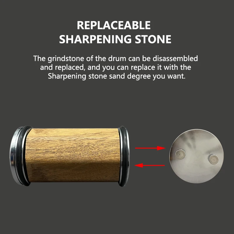 【 Strong magnetic adsorption 】 The drum sharpener is designed with magnets. The tool can firmly adhere to the magnet on the base, and will not fall even when slightly shaken. The back of the grinding stone also has magnetism, making replacement more convenient and fast;