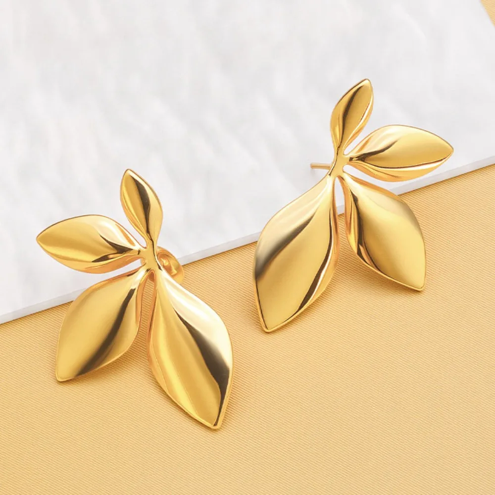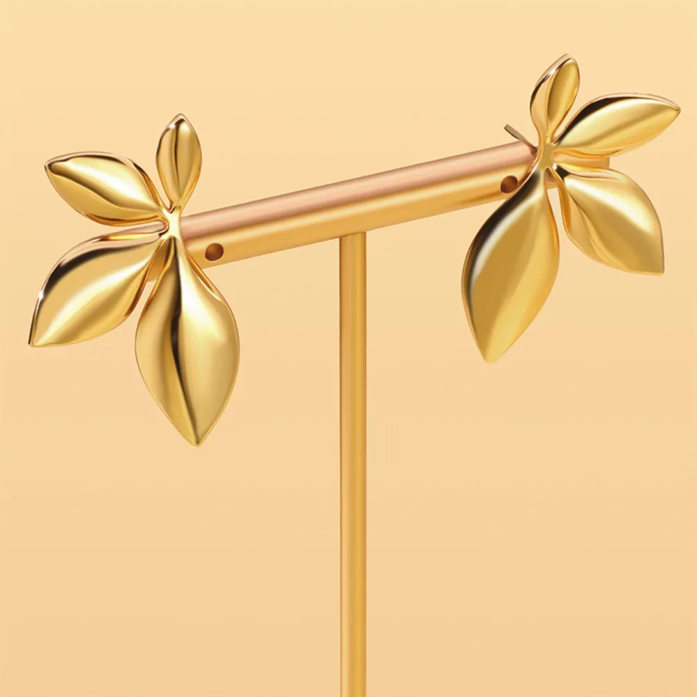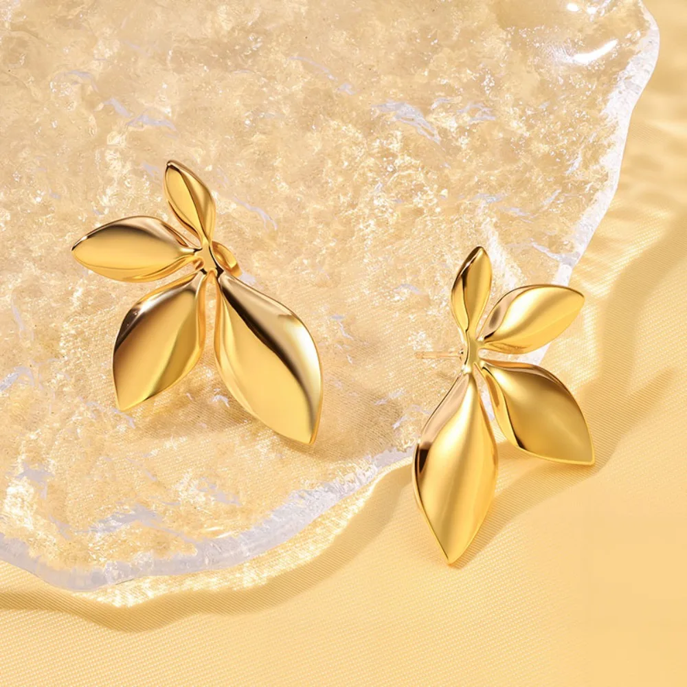 Fashion Temperament Stainless Steel Gold Color Shiny Surface Flower Petals Leaves Stud Earrings for Women Jewelry Accessory Gift