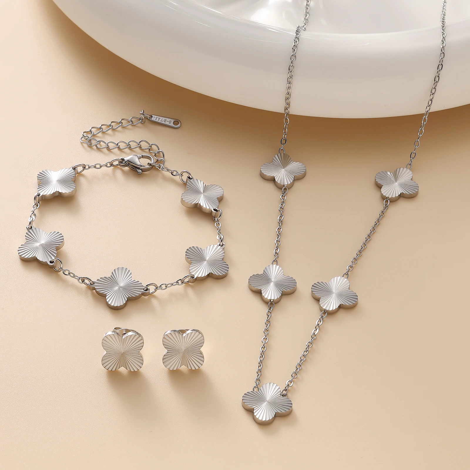 Fashionable stainless steel hand polished clover flower bracelet necklace earring set