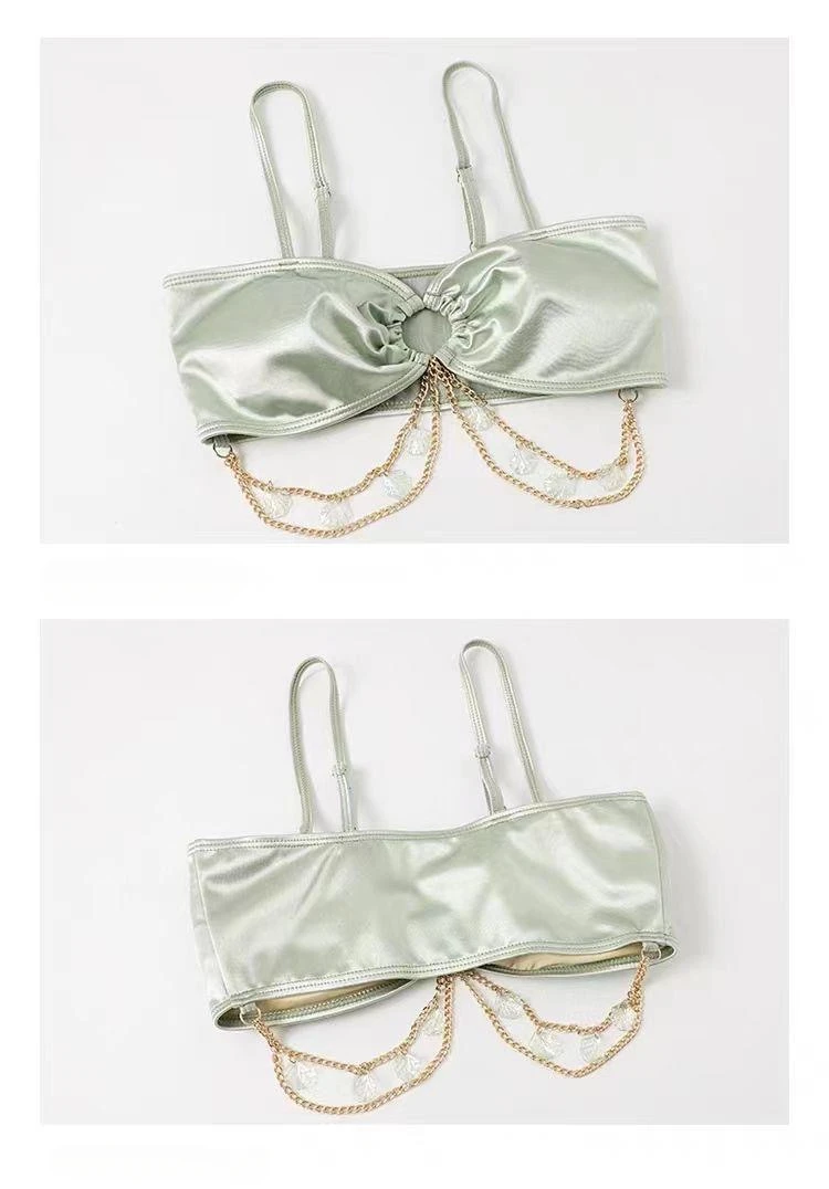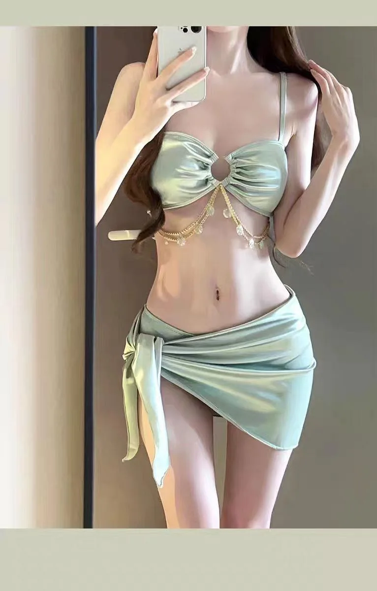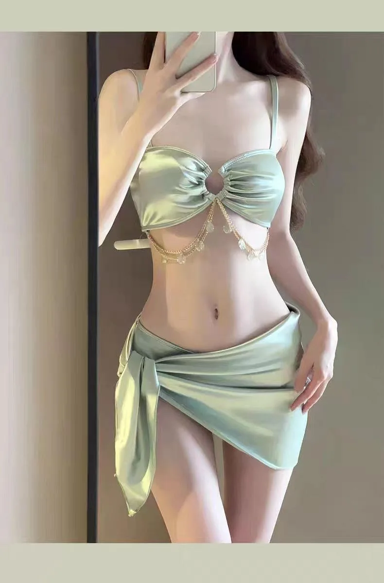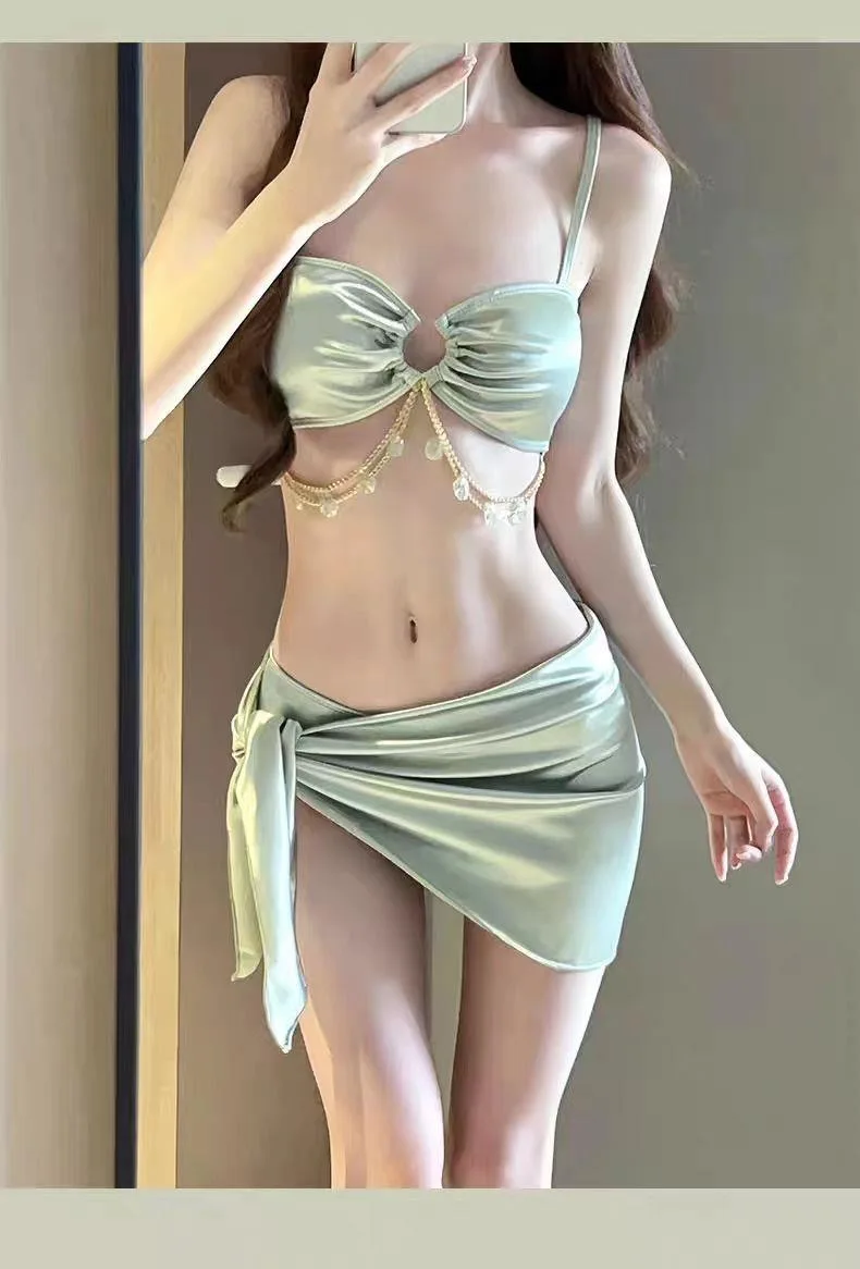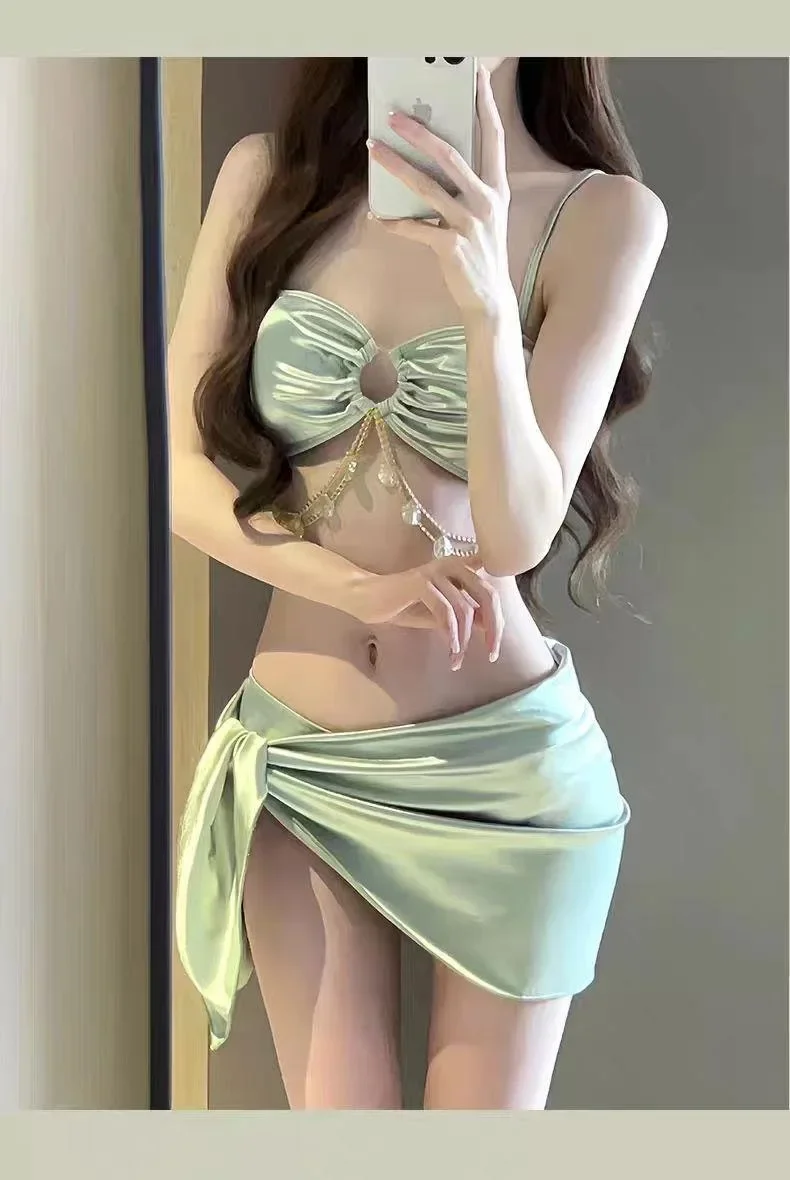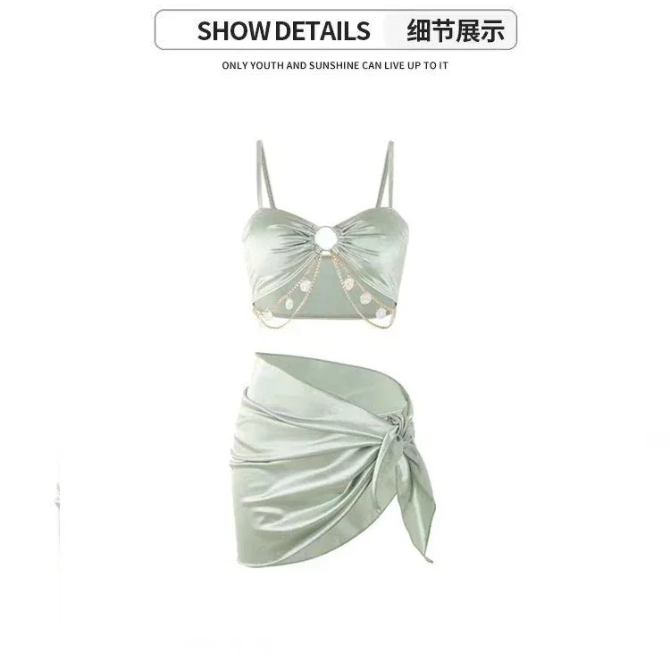 Light Green 3 Piece Swimsuit for Women,2024 New Solid Color Chain Bikini Set,summer Beach Vacation Skirt Swimwear Bathing Suit