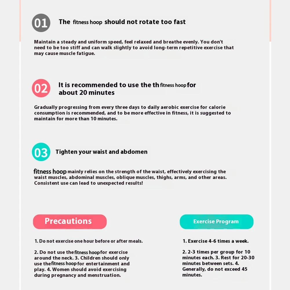 | Product | Included | Pink green gray: | 1x Fitness Hoop | Pink: | 1x Fitness Hoop | Blue: | 1x Fitness Hoop | Purple: | 1x Fitness Hoop |